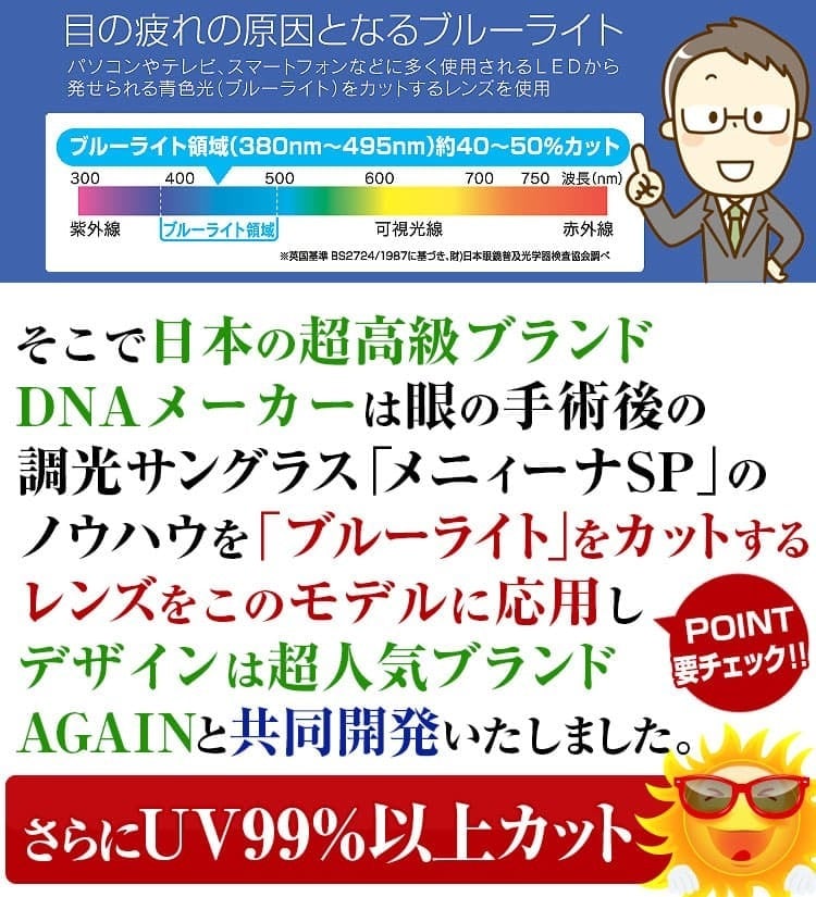 透明レンズで眼を守る 透明サングラス UV99%以上カット ブルーライト約40% AGAIN正規品 2026 NEWモデル