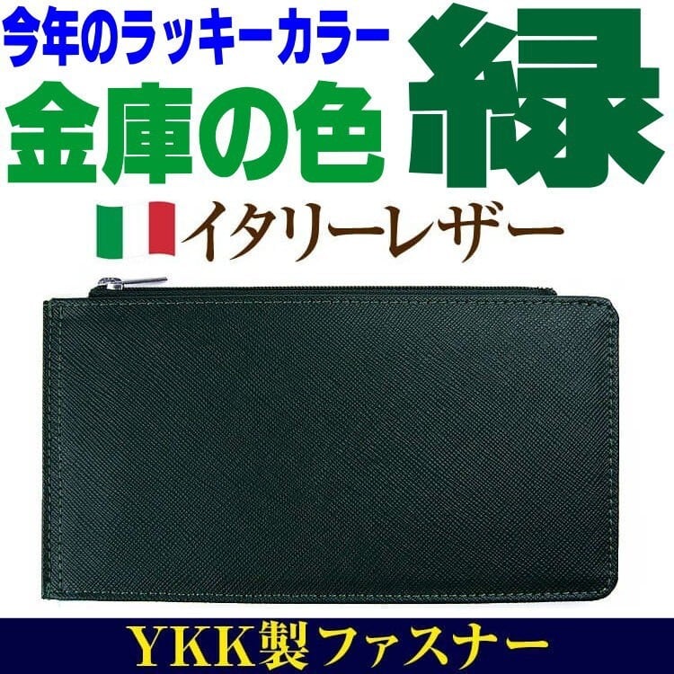 イタリーレザー緑の本革財布 スマートフォンやお札も入るカードケース YKKファスナー 小銭入れ 芦屋ダイヤモンド セール 送料無料