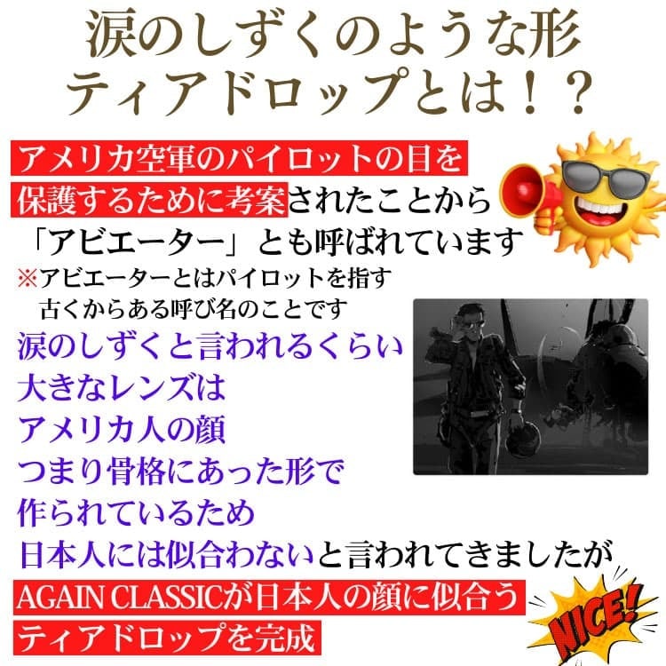 1833年からアメリカ空軍に愛された サングラス 日本製 鯖江の職人が挑む世界一を目指す究極の品質 AGAIN CLASSIC ティアドロップ型